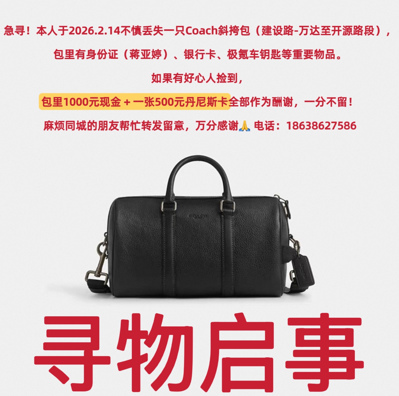 - 丢失黑色女士挎包